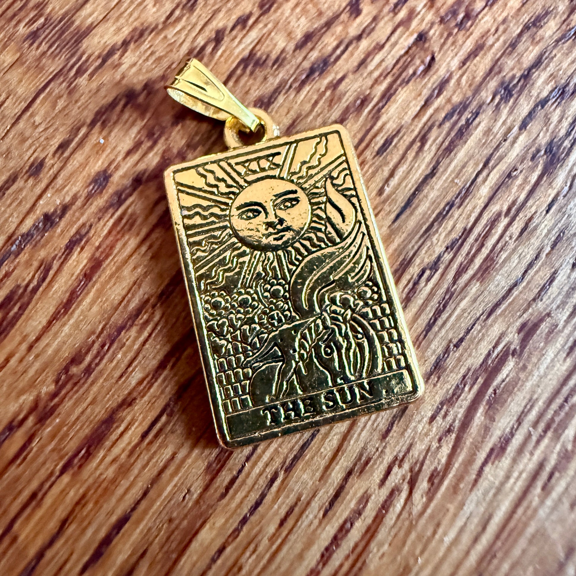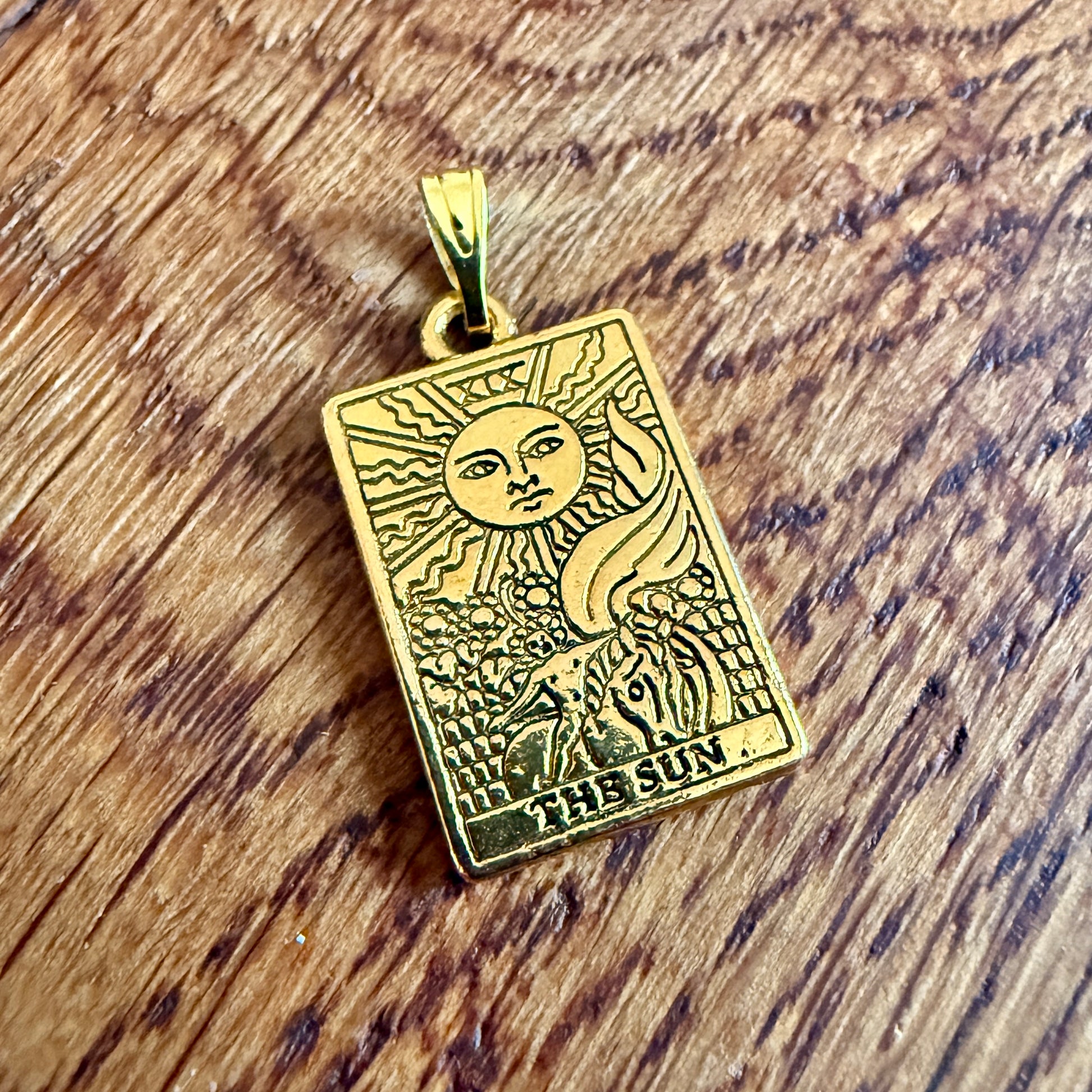This elegant vintage pendant depicts the Sun Tarot card, one of the most positive and luminous symbols in the deck, associated with happiness, success, and vitality. Crafted from gold-plated metal, the pendant features a thoughtful and detailed design, with a smiling sun radiating rays of light and a scene evoking abundance and joy.